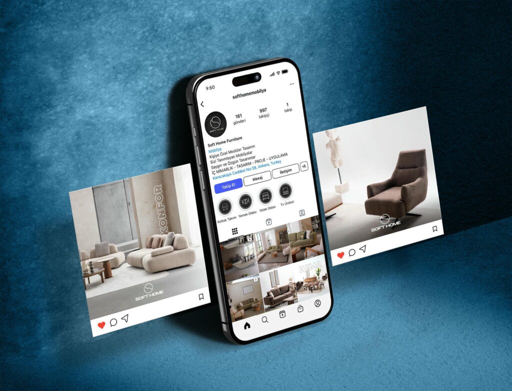 Mobilya sektöründeki trendleri takip ederek özgün görsel ve metin tasarımlarıyla markanın dijital dünyada öne çıkmasını sağlıyoruz. Kullanıcı etkileşimini artıran stratejiler ve satış odaklı dijital pazarlama çalışmalarıyla Soft Home Mobilya’yı rakiplerinden ayıran bir konuma taşıyoruz.